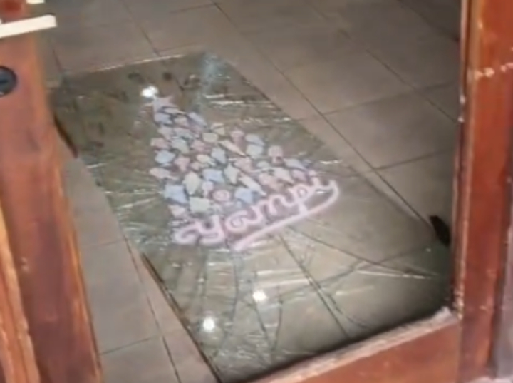 Vidrio destrozado por los delincuentes para acceder al local y robar