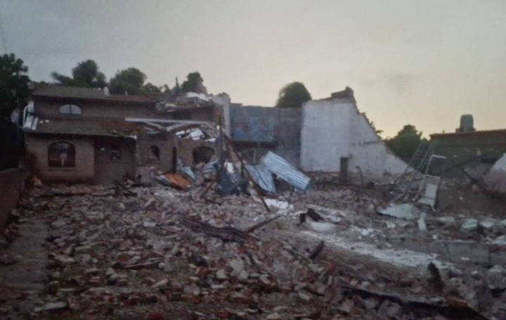 En el fondo del predio, los escombros cayeron sobre viviendas contiguas, donde dos mujeres resultaron heridas y fueron rescatadas por los Bomberos Voluntarios de Oliveros. El joven de la concesionaria también sufrió lesiones leves.