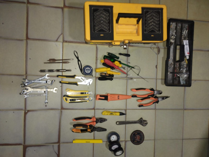 Tras inspeccionar la bolsa de residuos, los efectivos hallaron una caja de herramientas profesional (color negro y amarillo) que contenía un importante kit de trabajo compuesto por 12 destornilladores, una llave pico loro, un alicate, una1 pinza de punta, dos pinzas comunes, una llave inglesa y nueve llaves combinadas, un metro, un busca polo por inducción, dos trinchetas y un cuchillo. tres cintas aisladoras, tres mechas, lápices y una cantidad no especificada de tornillería.