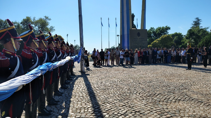Izamiento de la bandera argentina en el mástil principal del Campo de la Gloria