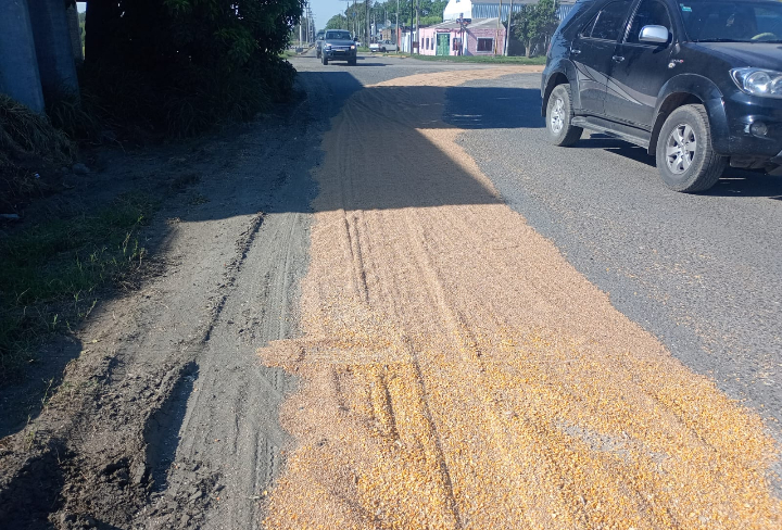 Los agentes también tomaron declaración al chofer de un camión Mercedes Benz 1634, quien relató que, durante la madrugada, mientras circulaba por esa misma intersección, personas desconocidas abrieron de manera ilegal la puerta trasera del acoplado, desde donde transportaba la carga de maíz que luego comenzó a derramarse sobre la calzada.