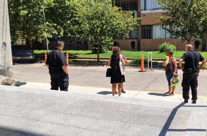Aunque había anticipado que se encadenaría en señal de protesta, finalmente no concretó esa medida, pero permaneció en el lugar visibilizando el reclamo junto a una amiga, Natalia, quien la acompañó durante toda la jornada.