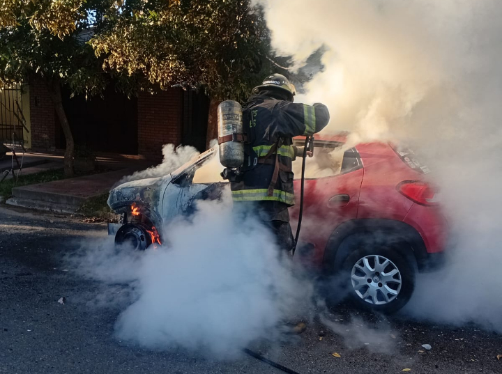 La alarma en el cuartel de la Agrupación Bomberos Zapadores se activó a las 7.55 hs. Al arribar al lugar, los efectivos se encontraron con un escenario crítico: un Renault Kwid color rojo se encontraba envuelto en llamas. El vehículo estaba estacionado correctamente sobre la calzada, orientado hacia el Este.