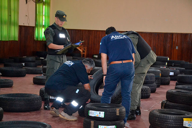Tras inspeccionar los bultos, los efectivos de la Fuerza junto con el personal de la Agencia de Recaudación y Control Aduanero “Delegación Santo Tomé” confirmaron la existencia de 287 cubiertas de distintos tamaños de origen extranjero, que eran enviadas bajo encomiendas sin el aval legal.