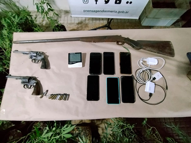 Posteriormente, los gendarmes dieron lectura del oficio judicial a los ocupantes de la vivienda e ingresaron a la misma, en el lugar encontraron 185 plantas y plantines de “cannabis sativa”, dos revólveres calibre .38 mm y una escopeta calibre 16 mm, municiones, un medidor adulterado con conexión irregular de alumbrado, dinero en efectivo y seis teléfonos celulares.