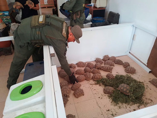 Al momento de la inspección, los funcionarios detectaron la presencia de animales dentro de bolsas tipo arpillera. Pudieron constatar que se trataba de 166 tortugas terrestres y 10 aves (nueve “cabecita negra” y un “picotero de collar”).