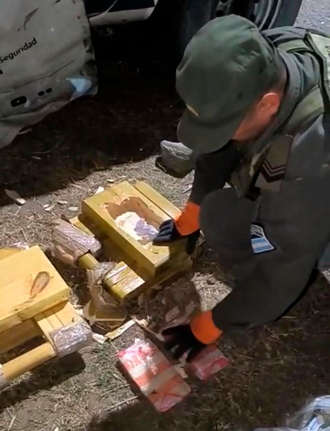 Ante este indicio, los gendarmes llevaron a cabo una inspección más minuciosa y constataron la existencia de un doble fondo, de ese lugar se retiraron seis “ladrillos” que contenían una sustancia blancuzca.