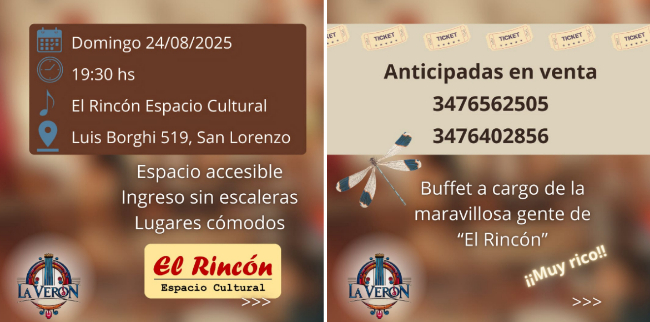Las entradas ya están a la venta y pueden solicitarse a través de las redes sociales de la artista –@patri.veron.ok y @laveron.ok, además de su perfil en Facebook– o bien por WhatsApp al 3476 562505.