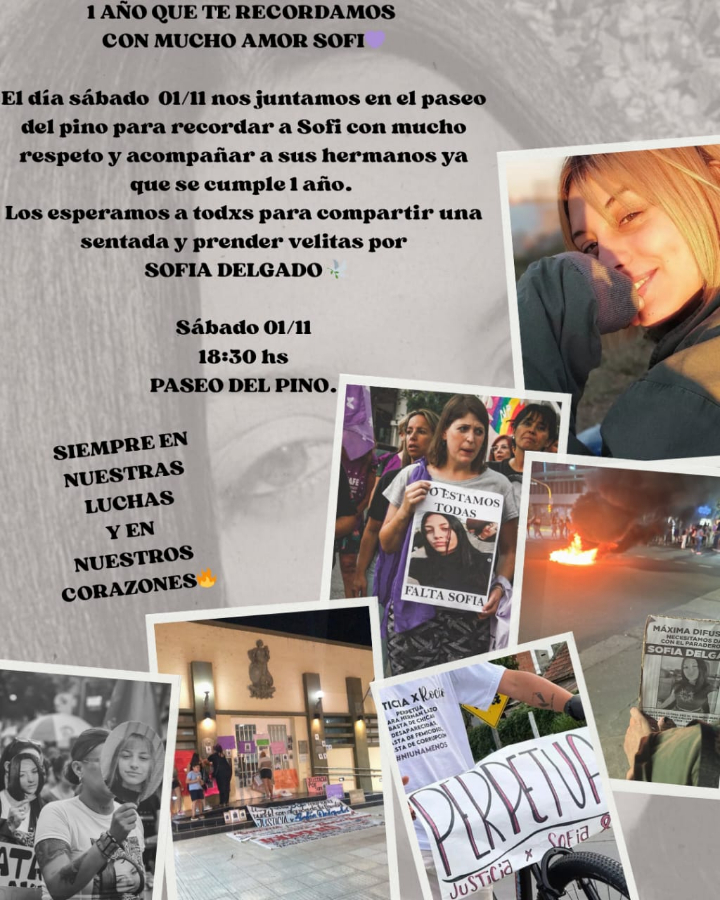Este sábado 1 de noviembre, familiares, amigas y vecinos se reunirán en el Paseo del Pino para recordar a Sofía Delgado, al cumplirse un año de su asesinato. La convocatoria será a las 18:30, en una sentada donde se encenderán velas en su memoria. “Nos juntamos con mucho respeto y acompañando a sus hermanos”, señalaron desde la organización del homenaje.