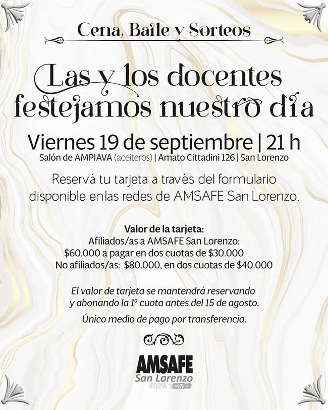 El viernes 19 de septiembre a las 21 h en el Salón de AMPIAVA (aceiteros), las y los docentes festejamos nuestro día con Cena, Baile y Sorteos entre los afiliados y afiliadas que hayan adquirido la tarjeta de la cena.