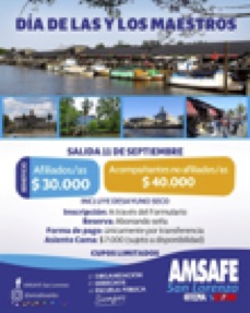 AMSAFE San Lorenzo este año organiza una jornada especial para celebrar nuestro día en Tigre, compartiendo junto a compañeros y compañeras de la Delegación. El viaje será el 11 de septiembre e incluye desayuno seco y traslado ida y vuelta, con un costo de $30000 para afiliados/as de AMSAFE San Lorenzo y $40000 para acompañantes no afiliados/as. Se trata de una oportunidad para desconectar de la rutina, encontrarnos fuera del aula y seguir fortaleciendo lazos. La inscripción se realiza a través del formulario disponible en redes de la Delegación.