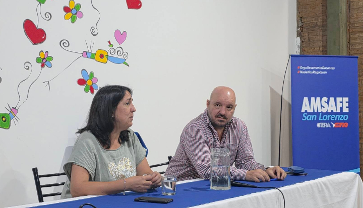 El secretario general de AMSAFE, Rodrigo Alonso, junto a la delegada seccional Adriana Monteverde, encabezaron la exposición. Ambos plantearon lo que describieron como “un profundo análisis sobre las consecuencias directas que estas medidas tienen sobre las y los trabajadores de la educación”.