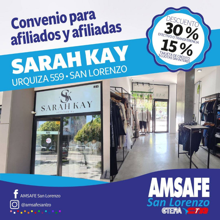 AMSAFE Delegación San Lorenzo anunció la firma de un nuevo convenio comercial con Sarah Kay (indumentaria), ubicado en Urquiza 559 de San Lorenzo. A partir de este acuerdo, las y los afiliados accederán al 30% de descuento abonando en efectivo o transferencia o al 15% de descuento con tarjeta de crédito y 3 cuotas sin interés