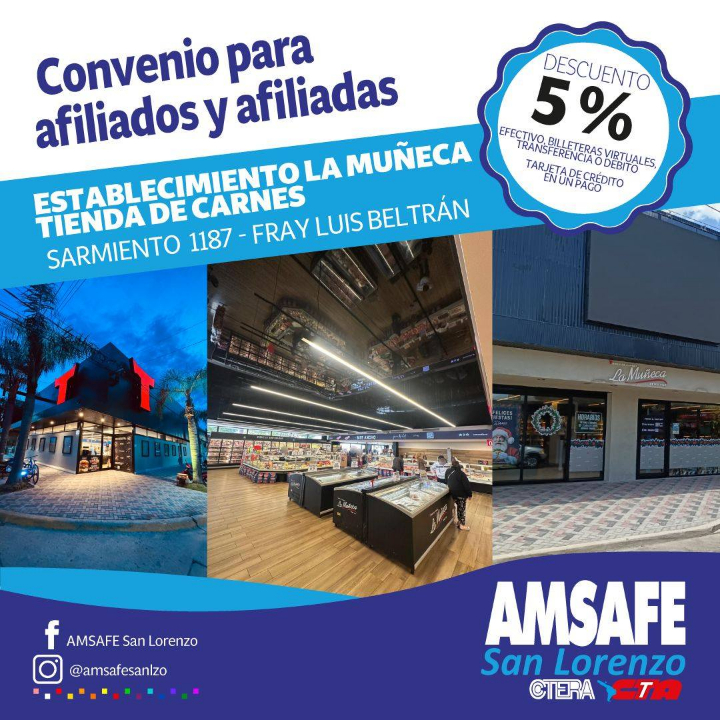 El gremio también comunicó un segundo convenio, firmado con “La Muñeca” Tienda de Carnes, ubicada en Sarmiento 1187 de Fray Luis Beltrán. Las afiliadas y los afiliados podrán obtener un 5% de descuento en mercaderías abonando en efectivo, billeteras virtuales, transferencia, débito o tarjeta de crédito en un pago.