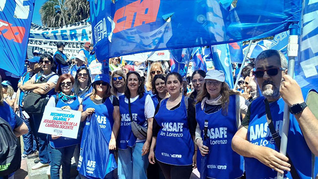 AMSAFE San Lorenzo participó activamente del paro nacional docente y la masiva movilización realizada en la Ciudad de Buenos Aires el 14 de octubre, convocada por CTERA. La concentración principal tuvo lugar frente al Palacio Pizzurno, sede del Ministerio de Educación de la Nación, donde se expresó con firmeza el reclamo por la defensa de la escuela pública y los derechos de las y los trabajadores de la educación.