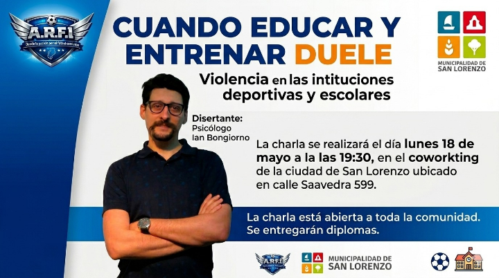 La disertación estará a cargo del psicólogo Ian Bongiorno, quien expondrá sobre las distintas formas de violencia que atraviesan a instituciones escolares y deportivas, así como también brindará herramientas para su prevención y abordaje.