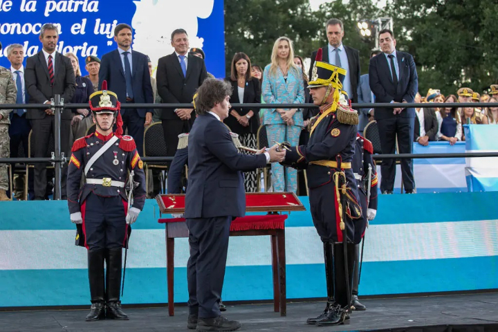 En el mismo sentido, el mandatario añadió: “Esta actitud libertadora, en post de corregir el mundo, romper las cadenas de la opresión y conquistar la libertad, debe guiarnos hoy y siempre en las decisiones que tomamos como nación. Por eso, hoy también consagramos en este acto el retorno del sable corvo del general San Martín al Regimiento de Granaderos. Se trata de la espada que trajo libertad a tierras que solo conocían el sometimiento, una espada que nos recuerda que la libertad es inclaudicable y que si uno lleva adelante los sacrificios que ella demanda, se pueden alcanzar cimas inmensas”.