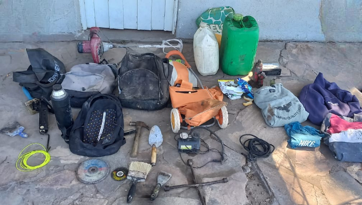 En el procedimiento se secuestraron varios elementos: dos bidones de nafta (de 5 y 10 litros), tres mochilas, una llave tubo, un gato hidráulico, un compresor, un par de rodilleras, un termo, prendas de vestir y una mezcladora eléctrica.