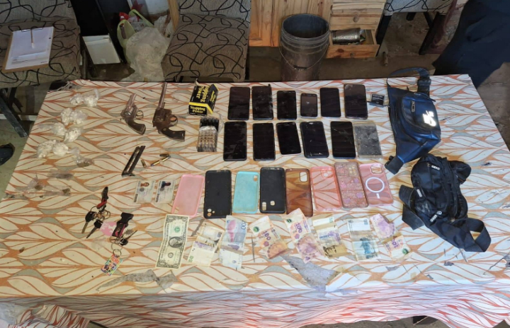 Durante los procedimientos, se incautaron dos revólveres calibre 38 (uno largo y otro cromado); municiones; cuatro bolsas con bochas de cocaína; una motocicleta Honda Wave; doce teléfonos celulares y otros elementos vinculados a la investigación.