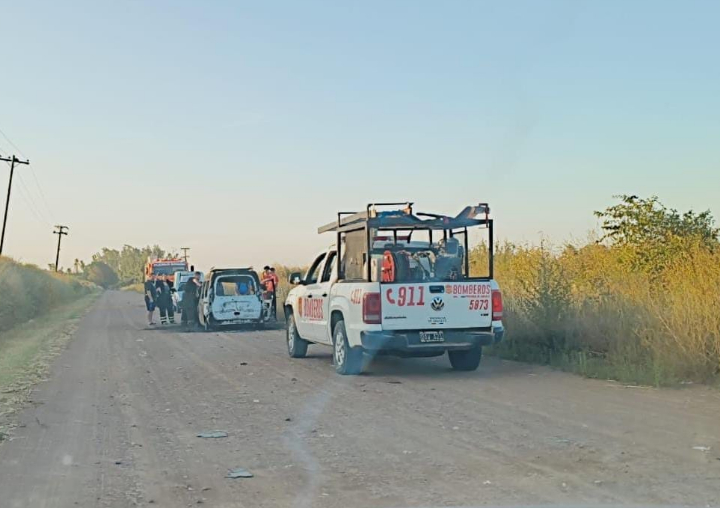 En el operativo también colaboraron efectivos policiales de Ricardone y Bomberos Voluntarios de Pueblo Andino. Finalizadas las tareas de extinción, los restos del utilitario fueron retirados a un sector seguro.