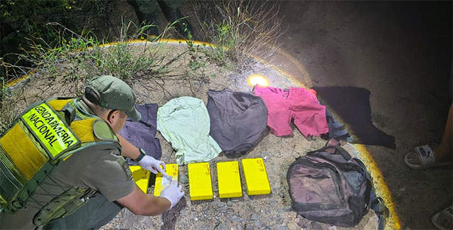 Tras constatar que los ciudadanos emprendieron una veloz fuga por la zona montuosa, arrojando un bulto sobre las vías, los gendarmes efectuaron un rastrillaje en el lugar y detectaron una mochila.