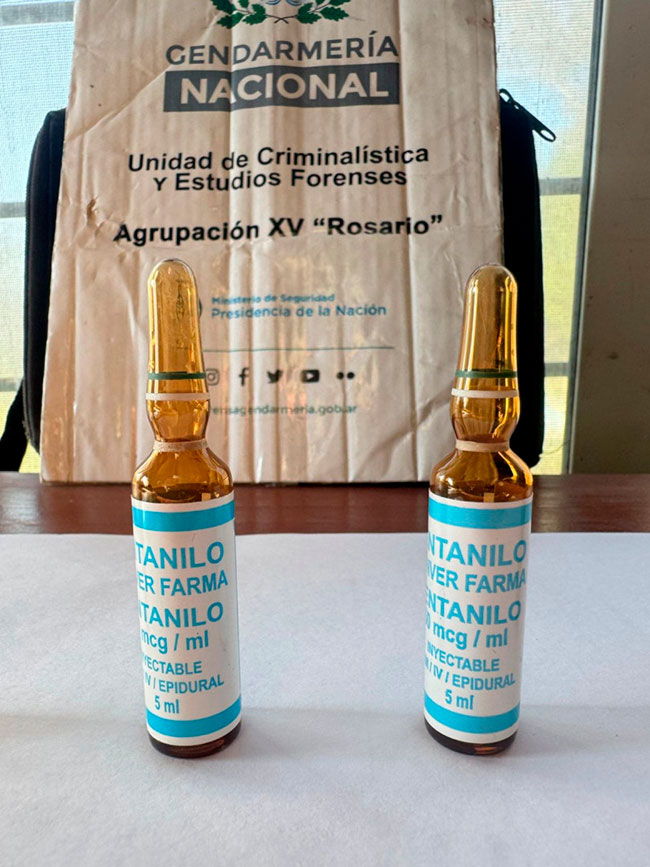En el domicilio ubicado en la ciudad santafesina de Rosario, los funcionarios decomisaron: seis ampollas de distintos medicamentos (4 de fentanilo, una de Detenler Clorh y la restante de Adrenalina Clorh), 24 frascos de 10 mg de Bromuro de Vercuronio, 24 gramos de marihuana, 98 jeringas, 5 comprimidos de Blokium, dos blíster de Metformina Clorhídrico y 30 cajas con 7 comprimidos c/u de Furosemida.