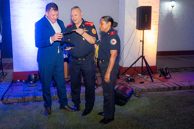 Monseñor Guedes, de bomberos de Ceibas, hizo entrega de un presente al intendente Raimundo.