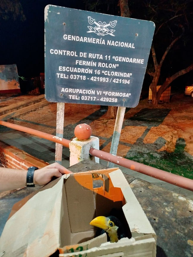 Dicha maniobra alertó a los uniformados, quienes en consecuencia se aproximaron al lugar y, luego de un rastrillaje a la vera de la ruta, hallaron una caja cerrada de cartón conteniendo en su interior un ejemplar vivo de ave correspondiente a la especie Tucán (familia Ramphastidae), dicho animal fue inmediatamente puesto a resguardo.