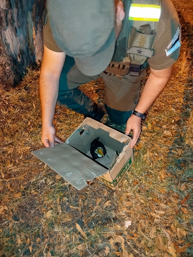 Ocurrió en Formosa y fue rescato por Gendarmes. Estaba encerrado en el interior de una caja de cartón. Un vehículo, al percatarse del puesto de control de los uniformados, descartó al ave desde la ventanilla del rodado. Los efectivos advirtieron dicha maniobra e inmediatamente luego de identificar al animal, lo pusieron a resguardo. Posteriormente fue entregado a personal de la Reserva Natural "Guaycolec" para su custodia, atención y cuidado.