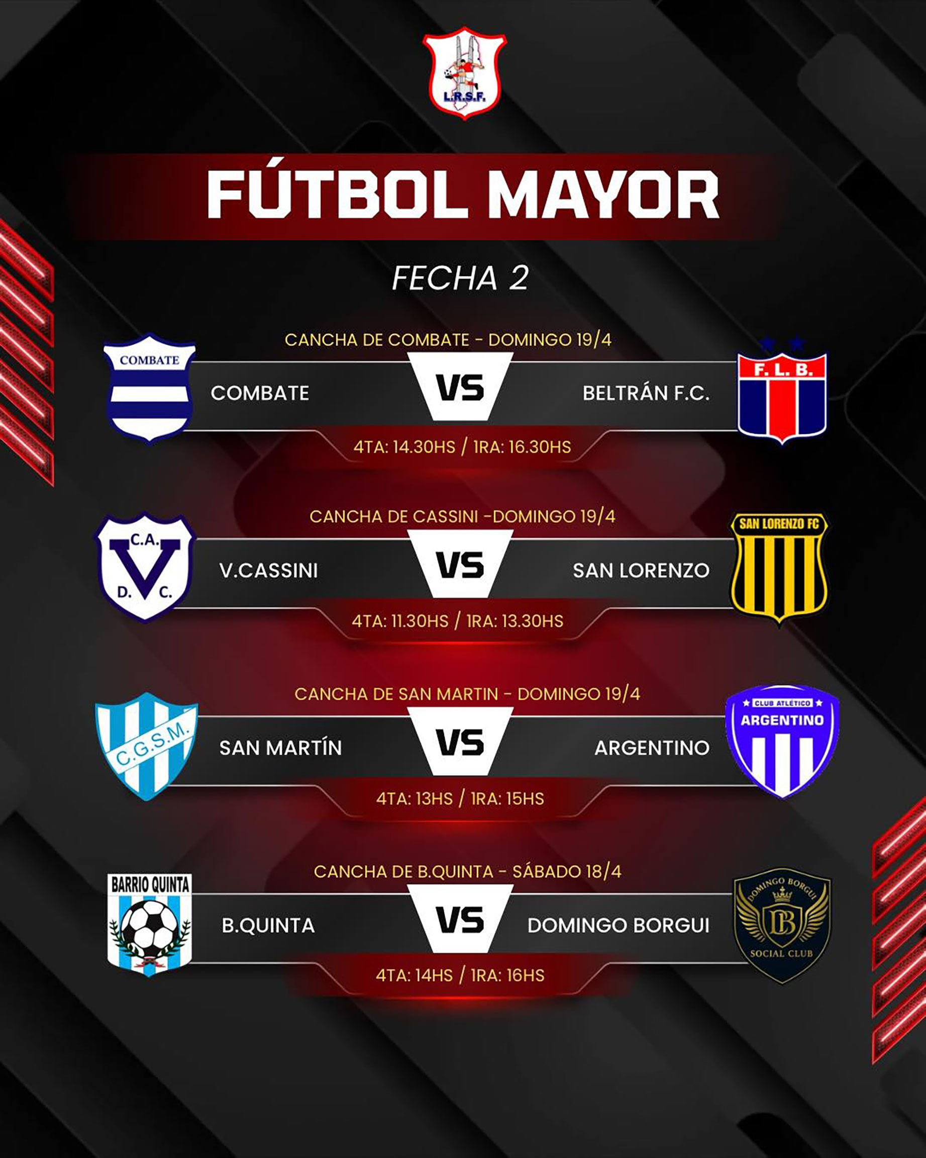- Combate vs. Beltrán FC (16.30 h): ambos vienen de igualar en la primera fecha y buscan su primer triunfo para no perderle pisada a los punteros.
