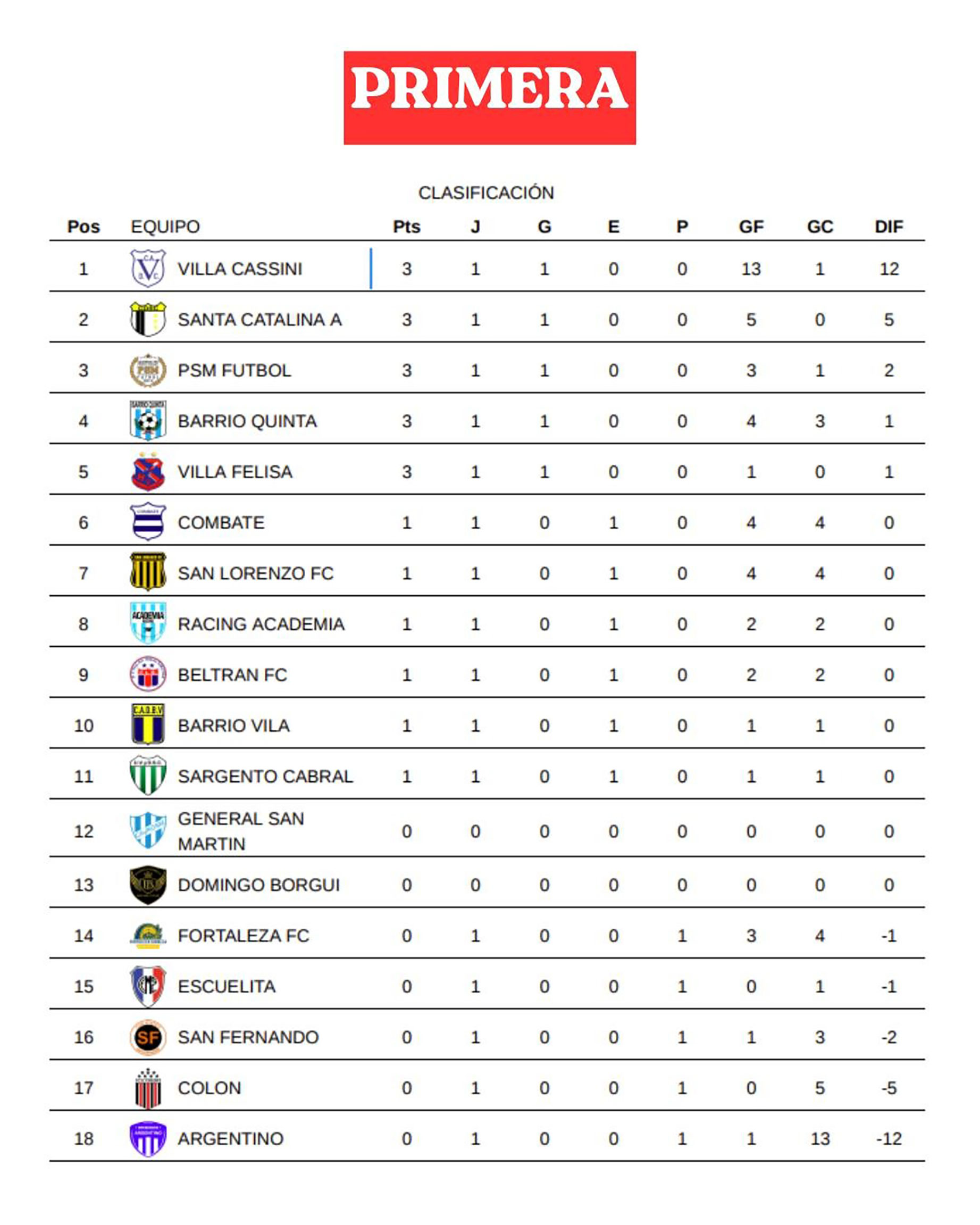 La tabla de posiciones es liderada con autoridad por Villa Cassini, que ostenta 3 puntos y una impresionante diferencia de gol de +12. Le siguen en el lote de los punteros, también con 3 unidades, Santa Catalina A (dif. +5), PSM Fútbol (dif. +2), Barrio Quinta (dif. +1) y Villa Felisa (dif. +1). En la zona media, con un punto tras empatar en sus respectivos debuts, se encuentran Combate, San Lorenzo FC, Racing Academia, Beltrán FC, Barrio Vila y Sargento Cabral. Por su parte, General San Martín y Domingo Borgui se ubican en la 12° y 13° posición respectivamente, aún sin unidades, pero también sin partidos jugados. Finalmente, en el fondo de la tabla y buscando salir del cero en esta segunda fecha, aparecen Fortaleza FC (dif. -1), Escuelita (dif. -1), San Fernando (dif. -2), Colón (dif. -5) y cerrando la clasificación en el 18° lugar, Argentino (dif. -12).