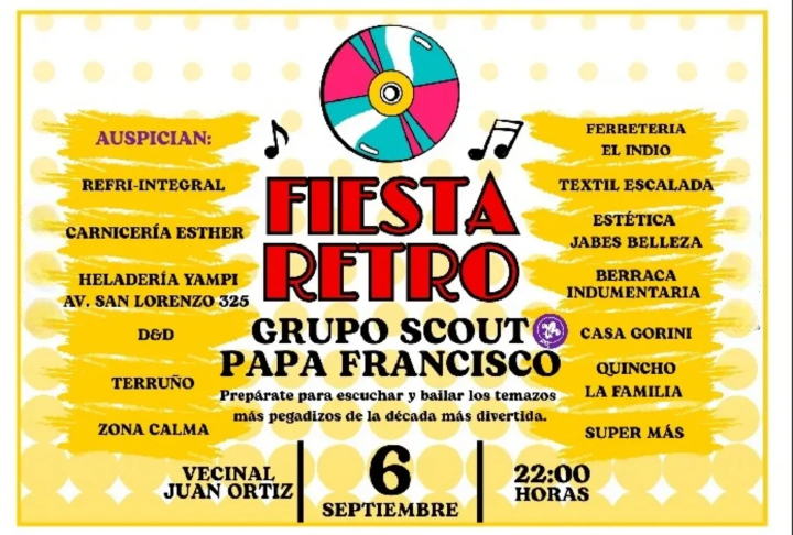 El Grupo Scout Papa Francisco, una ONG de Capitán Bermúdez perteneciente al Distrito 1 – Zona 19 de Scouts de Argentina, se prepara para vivir una noche especial con la organización de una Fiesta Retro destinada a mayores de 30 años, con el objetivo de recaudar fondos para su tradicional campamento de fin de año.